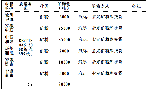 3.2022年6月至12月份礦粉計(jì)劃采購(gòu)量8萬(wàn)噸,具體如下: