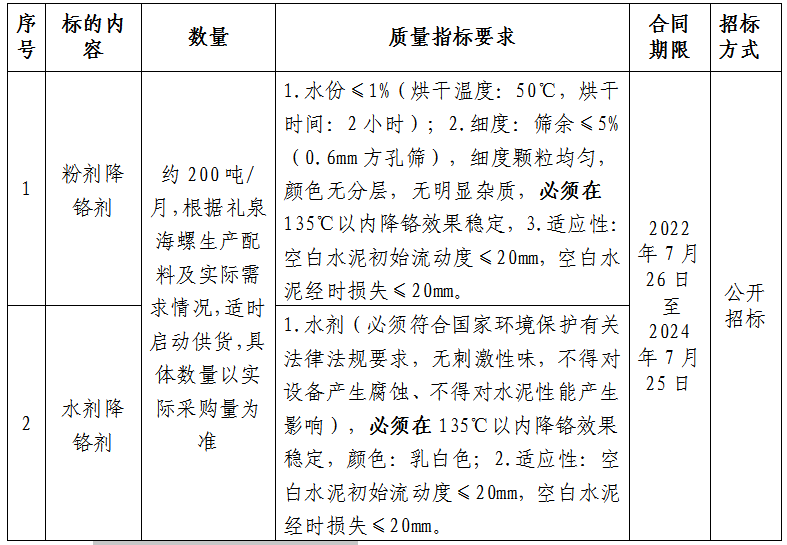 根據(jù)禮泉海螺生產(chǎn)需求,擬對2022-2024年度降鉻劑進(jìn)行公開招標(biāo),為進(jìn)一步體現(xiàn)“公平、公正、公開”的原則,此次招標(biāo)在安徽海螺水泥股份有限公司陽光采購平臺公開進(jìn)行。現(xiàn)將招標(biāo)采購信息發(fā)布如下: