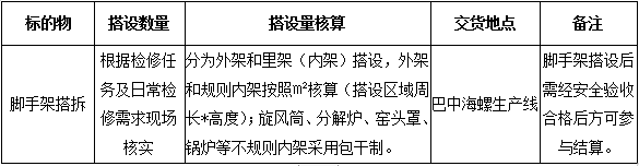根據(jù)巴中海螺生產(chǎn)經(jīng)營需求,為保障回轉(zhuǎn)窯、水泥磨及生產(chǎn)設(shè)備實(shí)施檢修期間的施工安全、質(zhì)量和進(jìn)度受控,部分區(qū)域需搭設(shè)腳手架。為確保腳手架搭設(shè)業(yè)務(wù)開展的合規(guī)性,本著公平、公正、公開、透明的原則,現(xiàn)將招標(biāo)相關(guān)事宜公告如下: