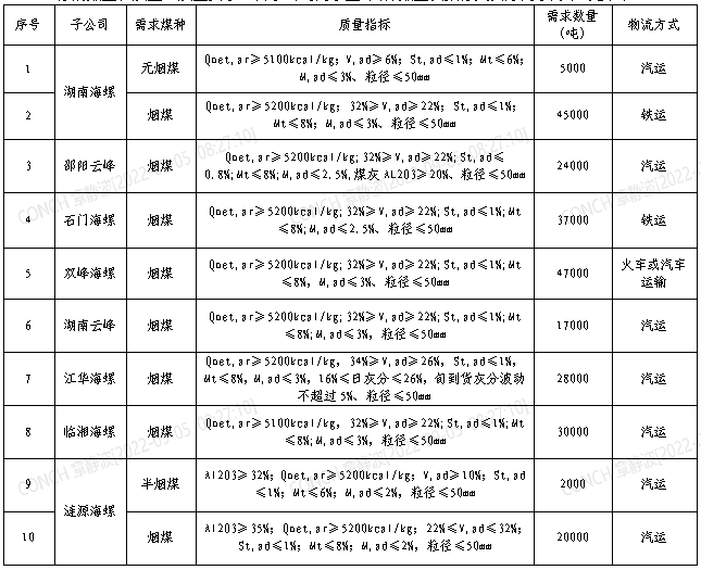根據(jù)2022年9月21日-2022年10月20日海螺水泥湖南區(qū)域各子公司煤炭需求,現(xiàn)擬對(duì)煤炭進(jìn)行公開招標(biāo),選定中標(biāo)人,為體現(xiàn)公平、公正、公開的原則,拓寬采購(gòu)渠道,現(xiàn)將招標(biāo)相關(guān)事宜公告如下: