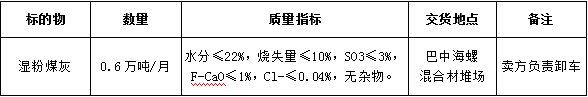 根據(jù)巴中海螺生產(chǎn)經(jīng)營需求,現(xiàn)對水泥生產(chǎn)用濕粉煤灰采購業(yè)務(wù)進行公開招標(biāo),為體現(xiàn)公平、公正、公開、透明的原則,現(xiàn)將招標(biāo)相關(guān)事宜公告如下: