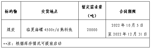 為做好我公司2022年煤炭采購工作,滿足生產(chǎn)需要,本著“公開、公平、公正”的原則,擬對煤炭直供渠道供貨進行公開招標,現(xiàn)將招標采購信息發(fā)布如下: