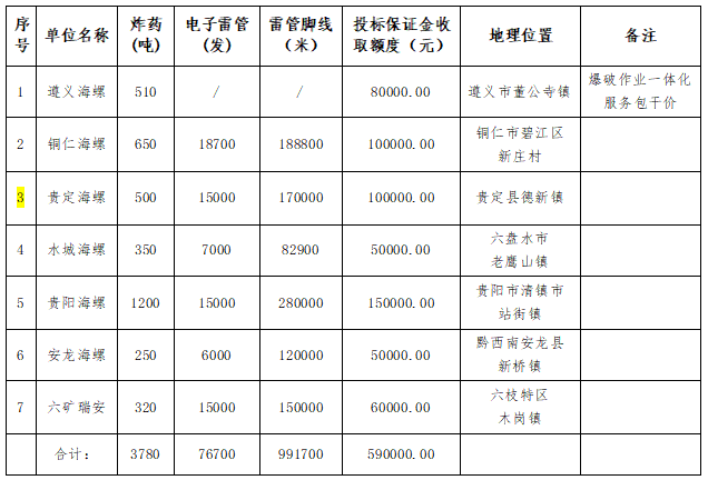 投標(biāo)人在報(bào)價(jià)時(shí)應(yīng)綜合考慮炸藥以及電子雷管的使用量、運(yùn)輸、人工成本以及爆破作業(yè)中一切不確定因素,具體詳見報(bào)價(jià)表,結(jié)合備注信息合理報(bào)價(jià)。投標(biāo)人在報(bào)價(jià)時(shí)應(yīng)綜合考慮炸藥以及電子雷管的使用量、運(yùn)輸、人工成本以及爆破作業(yè)中一切不確定因素,具體詳見報(bào)價(jià)表,結(jié)合備注信息合理報(bào)價(jià)。根據(jù)國家法律法規(guī)規(guī)定,同一家單位不能同時(shí)做外委爆破、安全監(jiān)理和安全評估,若一家單位同時(shí)參與三個(gè)標(biāo)段投標(biāo),則優(yōu)先考慮外委爆破標(biāo)段,其次是安全監(jiān)理標(biāo)段,最后是安全評估標(biāo)段。