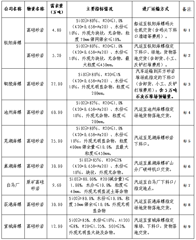 根據(jù)生產(chǎn)需求,本著“公開、公平、公正”的原則,擬對省內(nèi)和皖北區(qū)域部分子公司(白馬山水泥廠、蕪湖海螺、荻港海螺、銅陵海螺、池州海螺、樅陽海螺、宣城海螺和巢湖海螺)外購砂巖進(jìn)行公開招標(biāo),歡迎具備條件的單位參加,現(xiàn)將招標(biāo)相關(guān)事宜公告如下: