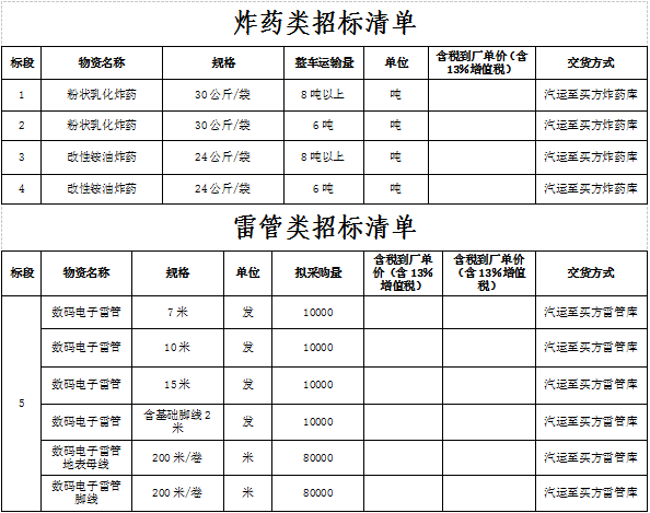 1.招標物資名稱:火工材料(改性銨油炸藥、粉狀乳化炸藥、工業(yè)雷管及導爆管)。