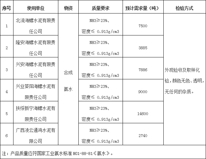 4.交貨地點(diǎn):廣西區(qū)域各海螺子公司現(xiàn)場(chǎng)氨水存儲(chǔ)罐。