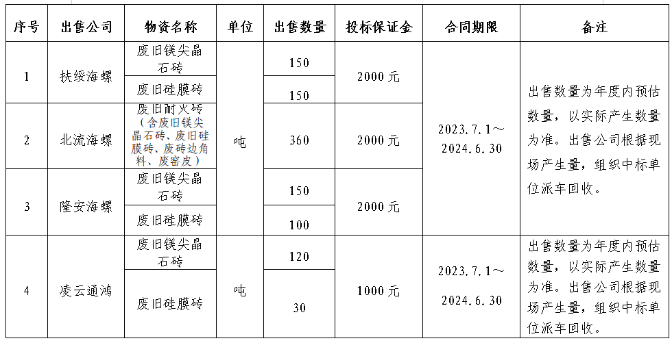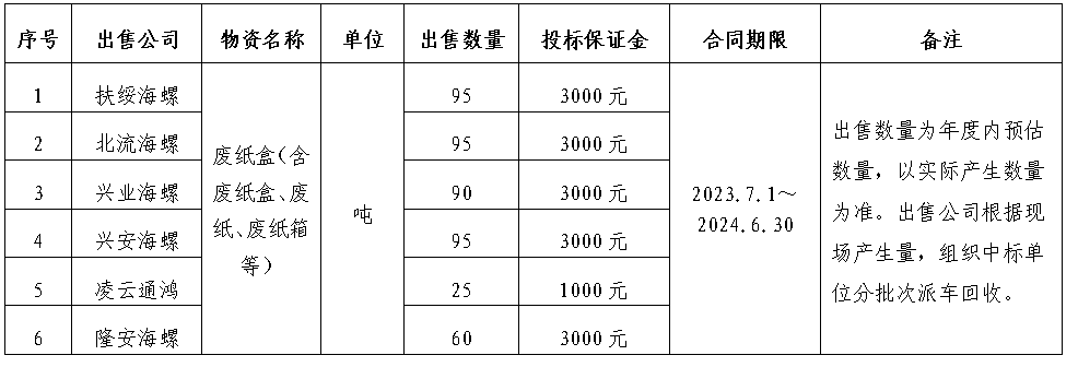 為規(guī)范區(qū)域內(nèi)各公司自動插袋包裝機所用自動袋外包裝紙盒(簡稱:廢紙盒)、廢舊耐火磚出售管理,保證廢紙盒、廢舊耐火磚出售過程的公開、公平、公正,擬開展廣西區(qū)域2023-2024年度廢紙盒、廢舊耐火磚出售招標(biāo)工作,現(xiàn)將招標(biāo)信息公示如下: