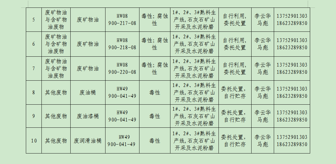 第五條 公司產(chǎn)生的危廢有:A.廢機(jī)油主要產(chǎn)生于礦山分廠、制造分廠,屬于修理機(jī)器時(shí)產(chǎn)生廢物,數(shù)量不大,年產(chǎn)生量20—50噸之間;B.其他危險(xiǎn)廢物,產(chǎn)生于機(jī)油、油漆等使用環(huán)節(jié),數(shù)量不大,年產(chǎn)生量在10—30噸之間;C.廢油手套、棉紗等危廢產(chǎn)生于員工平時(shí)作業(yè)和維修機(jī)器等環(huán)節(jié),數(shù)量少。