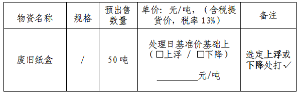 2、對(duì)于本次廢紙盒投標(biāo)價(jià)格采用卓創(chuàng)資訊網(wǎng)(https://index.sci99.com)廢紙價(jià)格指數(shù)報(bào)價(jià),出售價(jià)格為出售當(dāng)日(以車輛重車過磅時(shí)間為準(zhǔn))卓創(chuàng)資訊網(wǎng)廢紙價(jià)格指數(shù)±xx元/噸。若處理當(dāng)日指數(shù)停發(fā),以停發(fā)前一日發(fā)布的指數(shù)為準(zhǔn)。