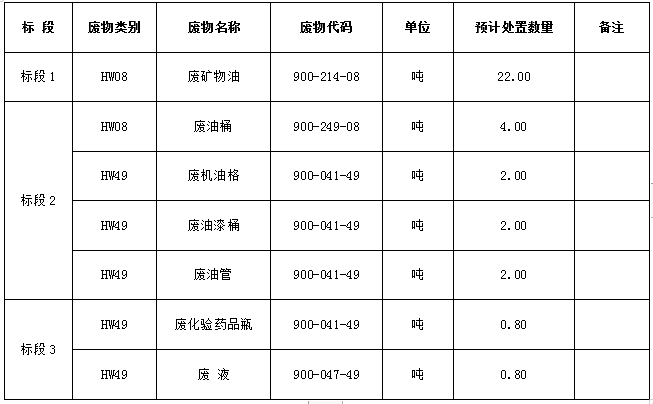 1.處置標(biāo)的內(nèi)容:廢礦物油、廢油桶、廢機(jī)油格、廢油漆桶、廢油管、廢化驗藥品瓶、廢液。