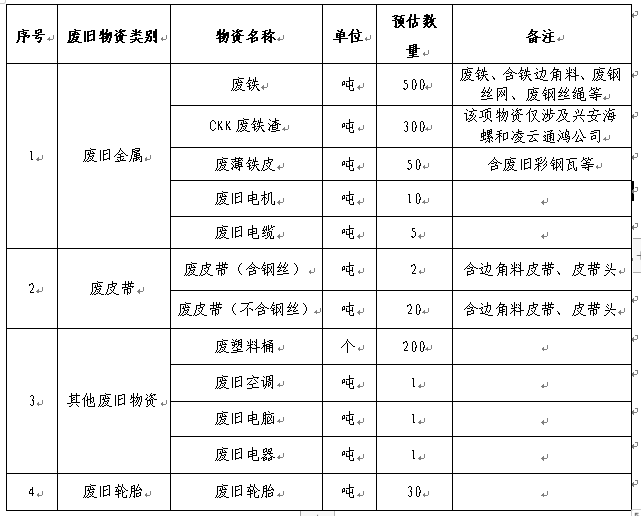 1.包含但不限于以上廢舊物資類別,同時數(shù)量僅為預(yù)估數(shù)量,具體數(shù)量以實際過磅或點數(shù)回收數(shù)量為準(zhǔn)。