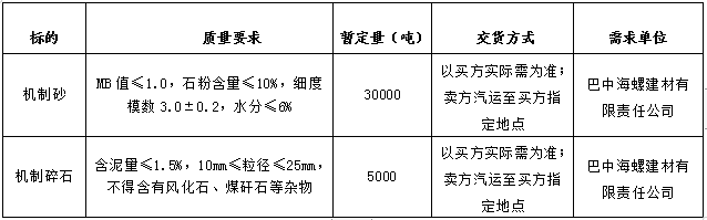 根據(jù)我公司商砼生產(chǎn)經(jīng)營對外購砂石需要,現(xiàn)擬開展巴中海螺建材外購砂石招標(biāo)采購工作,為規(guī)范物資采購行為,嚴(yán)格遵循公平、公正、公開的原則,現(xiàn)將招標(biāo)采購信息發(fā)布如下: