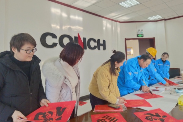 在制造燒成、礦山汽修廠房、水泥維修值班室、辦公樓會議室,許多員工翻看公司準(zhǔn)備的對聯(lián)書、在手機(jī)上查找自己喜歡的對聯(lián),早早排起了長隊。