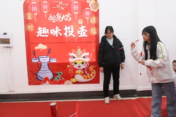 “趣味投壺”攤位同樣吸引眼球,大家手持飛箭,瞄準(zhǔn)目標(biāo),紛紛嘗試將飛箭投入壺中,仿佛穿越回古代游園盛會。投壺過程中,有的參與者憑借精準(zhǔn)的投擲技巧,輕松地將飛箭投入壺中,兌換到了獎?wù)?;而有的則在一次次嘗試中不斷調(diào)整姿勢和力度,享受著投壺帶來的樂趣?,F(xiàn)場氣氛緊張而熱烈,歡聲笑語不斷。