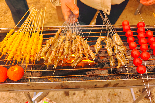 點(diǎn)爐、加碳、翻面、撒料……煙火揚(yáng)起,恣意的香氣在一陣陣“滋啦”聲中漸漸彌漫開來。炭火烘烤著美味,油光將肉片浸潤,在升騰的煙火氣中,因慢跑、志愿服務(wù)活動(dòng)而叫囂的轆轆饑腸在此刻被美食撫慰……