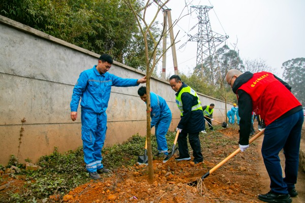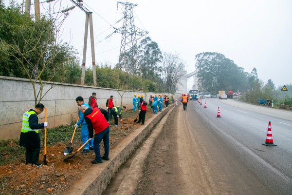 活動(dòng)現(xiàn)場(chǎng),扶綏海螺的20余名職工代表與桂西公路發(fā)展中心黨員干部、青年志愿者分工協(xié)作,揮鍬鏟土、扶苗培土、澆水定根,一派繁忙景象。經(jīng)過(guò)數(shù)小時(shí)勞作,共種植紫花風(fēng)鈴喬木50余株,綠化路段2.5公里,新栽樹苗整齊排列,與去年煥然一新的路面相映成輝,勾勒出“車在綠中行,人在景中游”的生態(tài)畫卷。