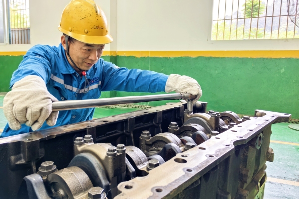 礦山分廠工程機械維修工馮勝元全神貫注地操控著扭力扳手,對TR50礦車發(fā)動機連桿螺栓實施精準施力。這項看似簡單的預緊作業(yè),實則是保障動力核心穩(wěn)定運轉(zhuǎn)的關鍵工序,凝結(jié)著延長設備服役周期的匠心。(胡萬禹/攝)