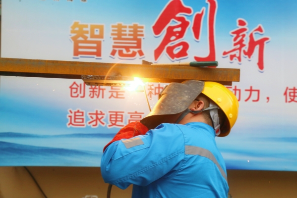 同一賽場上,制造分廠機械維修工馮雙正在馬不停蹄地進行手工焊接,飛濺的焊花與“智能創(chuàng)新”的標語交相輝映。(陳龍/攝)
