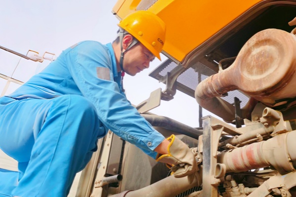 水泥分廠裝載機班長黃尤紅正在對裝載機進行360度巡檢,確保車輛性能完好,為水泥生產(chǎn)原材料輸送效率提供可靠的保障。(楊雪峰/攝)