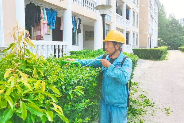 辦公室后勤綠化工黃斗忠正在后勤區(qū)域?qū)G植進行修剪,讓綠植既保持自然生機又呈現(xiàn)幾何美感,試圖將工業(yè)廠區(qū)變成園林式生態(tài)空間。(楊玲/攝)