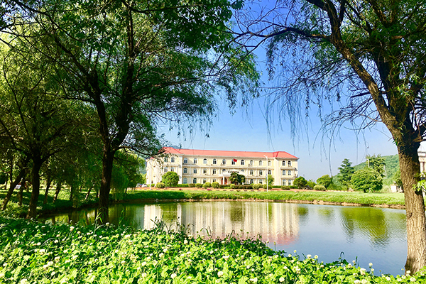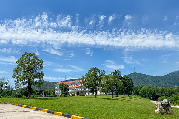 藍(lán)天白云下,蔥郁樹(shù)木錯(cuò)落點(diǎn)綴著如茵綠草,遠(yuǎn)處的辦公樓靜立其間,連綿青山為幕,勾勒出一幅明媚清新的自然景致。