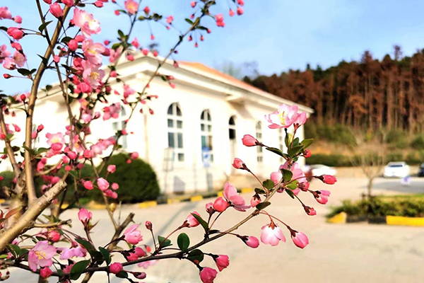 “無(wú)人會(huì)得東風(fēng)意,春色都將付海棠”。在食堂門(mén)前,一株株海棠嬌艷似少女的笑靨,微風(fēng)輕拂,花朵如粉蝶般飄舞。