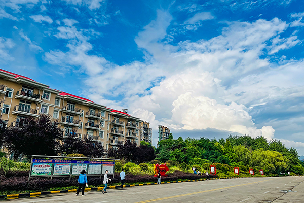 藍(lán)天白云悠然鋪展,公司萬(wàn)噸線宿舍樓與蔥郁綠植相映成趣,行人于開(kāi)闊道路間漫步,在晴朗日光里勾勒出一幅閑適生動(dòng)的生活畫(huà)卷。