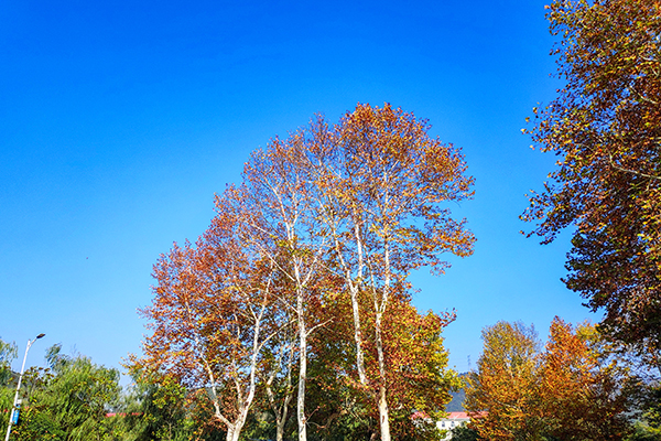 湛藍(lán)天空下,樹(shù)木枝葉浸染斑斕秋色,于工業(yè)景致中勾勒出一抹自然暈染的生機(jī)畫(huà)卷。