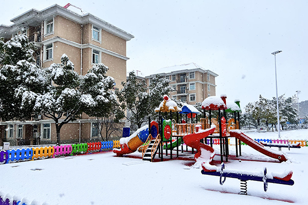 皚皚白雪包裹著童趣盎然的游樂(lè)場(chǎng),與遠(yuǎn)處淺褐色的宿舍樓剪影相映成趣。