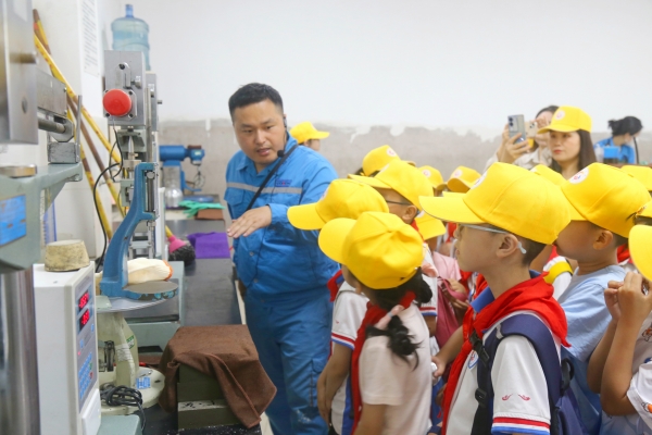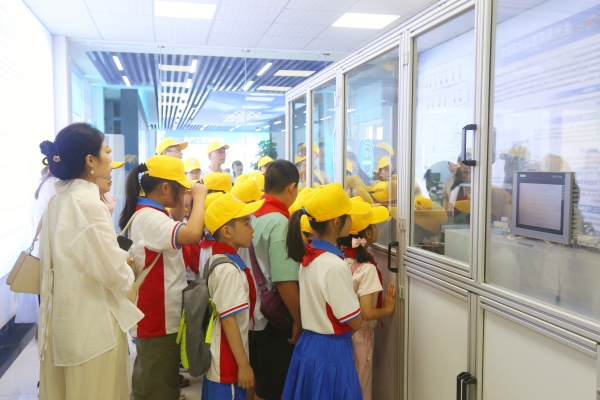 泛滿藍色燈光的中控室內,科技感拉滿,孩子們被眼前景象所震撼,數(shù)十塊電子屏閃爍著數(shù)據(jù)和圖表,仿佛是工業(yè)“大腦”;遍布精密儀器設備的實驗室內,孩子們圍觀著機械臂精準抓取樣品的操作,仿佛置身魔術表演空間,“這機械手臂可以幫我批改作業(yè)嗎?”突然一句天真無邪的話讓整個場景變得趣味橫生!