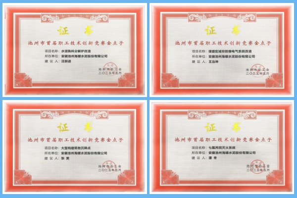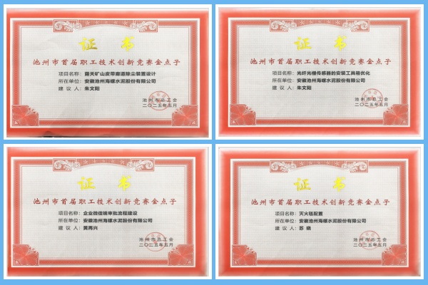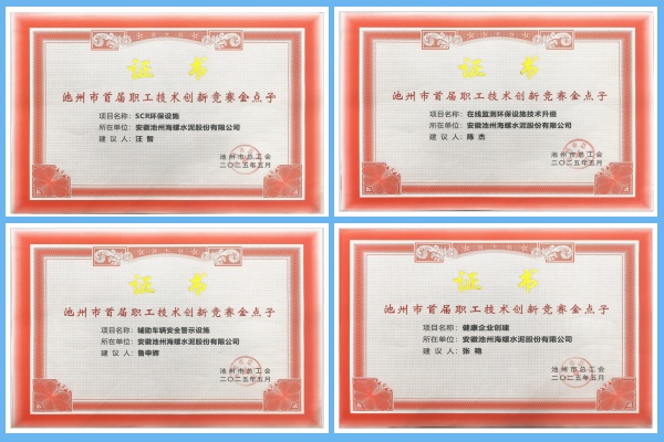 2025年11月,池州海螺榮獲池州市總工會(huì)頒發(fā)的多項(xiàng)證書嘉獎(jiǎng),以表彰其在池州市首屆職工技術(shù)創(chuàng)新競(jìng)賽中所取得的優(yōu)異成績(jī)。